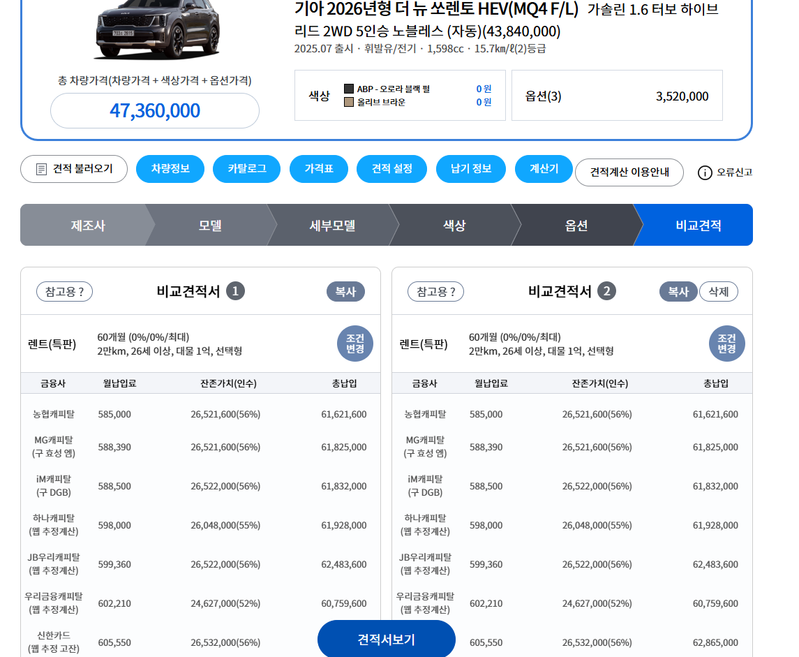 쏘렌토 하이브리드 5인승 노블레스기준 60개월 2만키로 무보증 1피 렌트기준 ( 스타일 , 드와 . 빌트인캠 ) 차챵가 47,360,000원